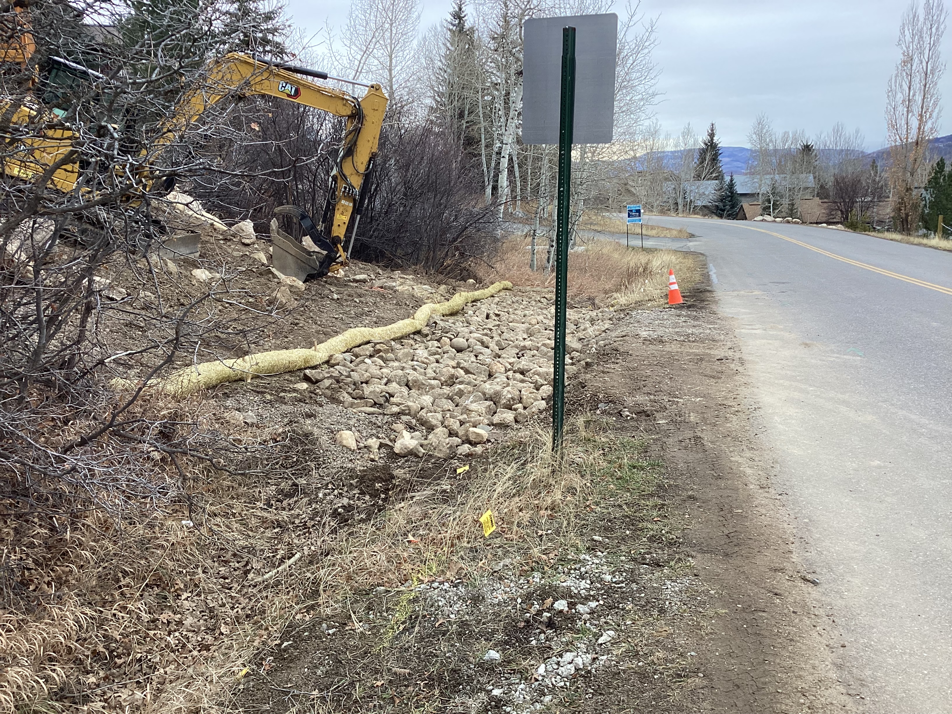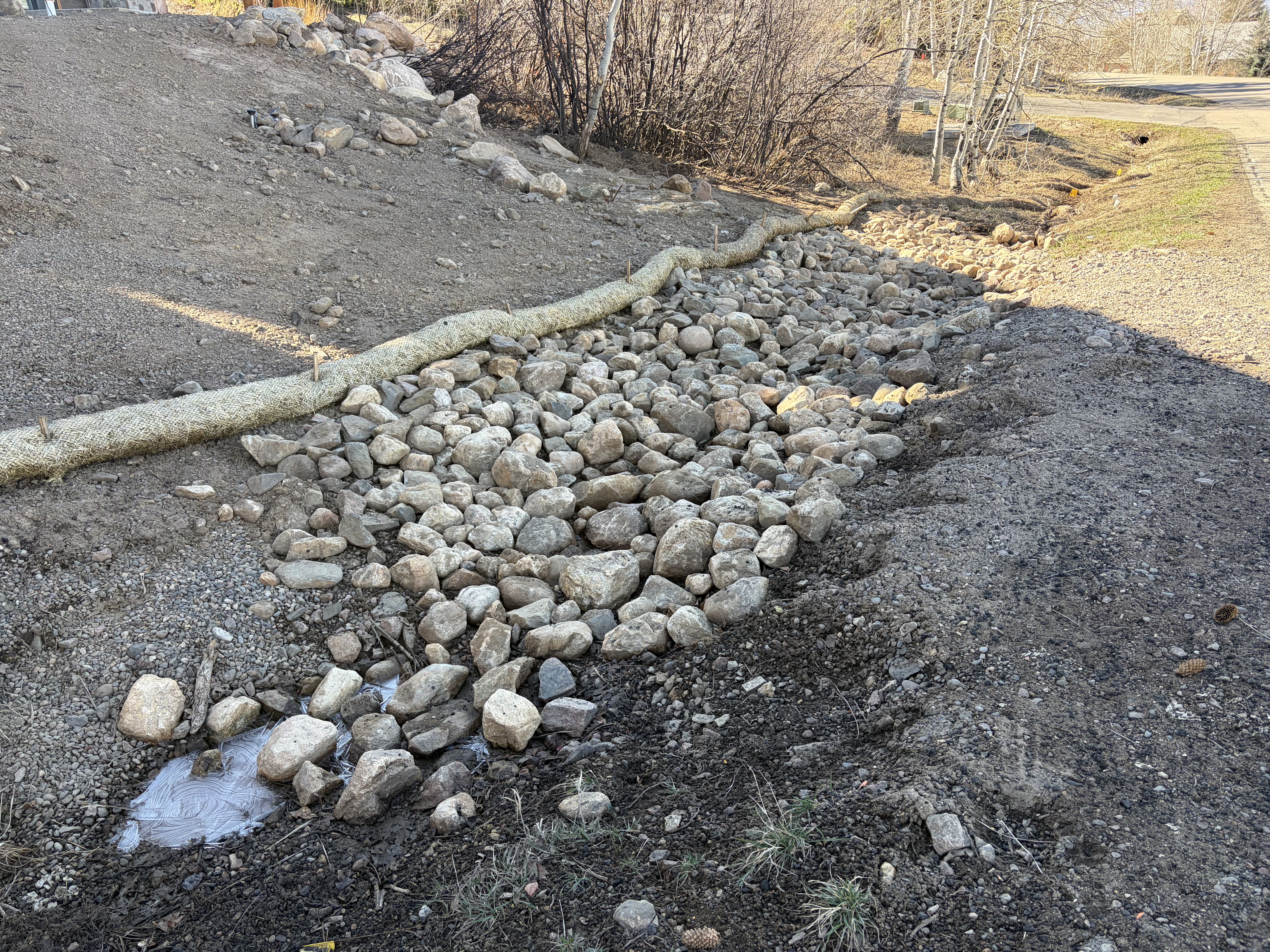 All disturbed soils must be stabilized with native seed mix and biodegradable erosion control blankets including the drainage ditch on Sundance.