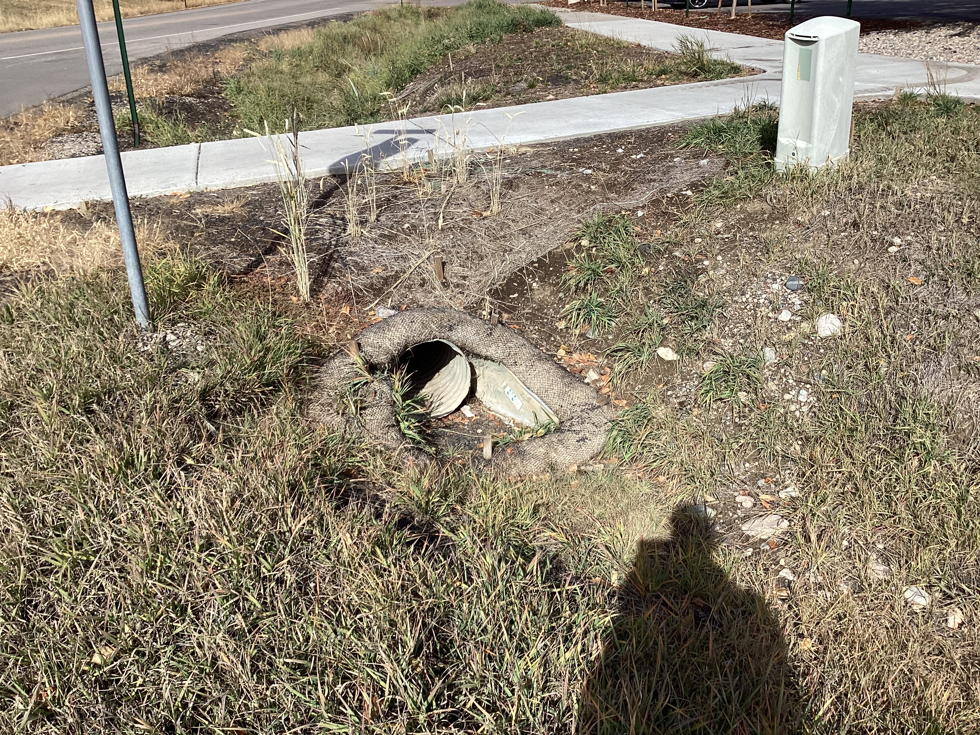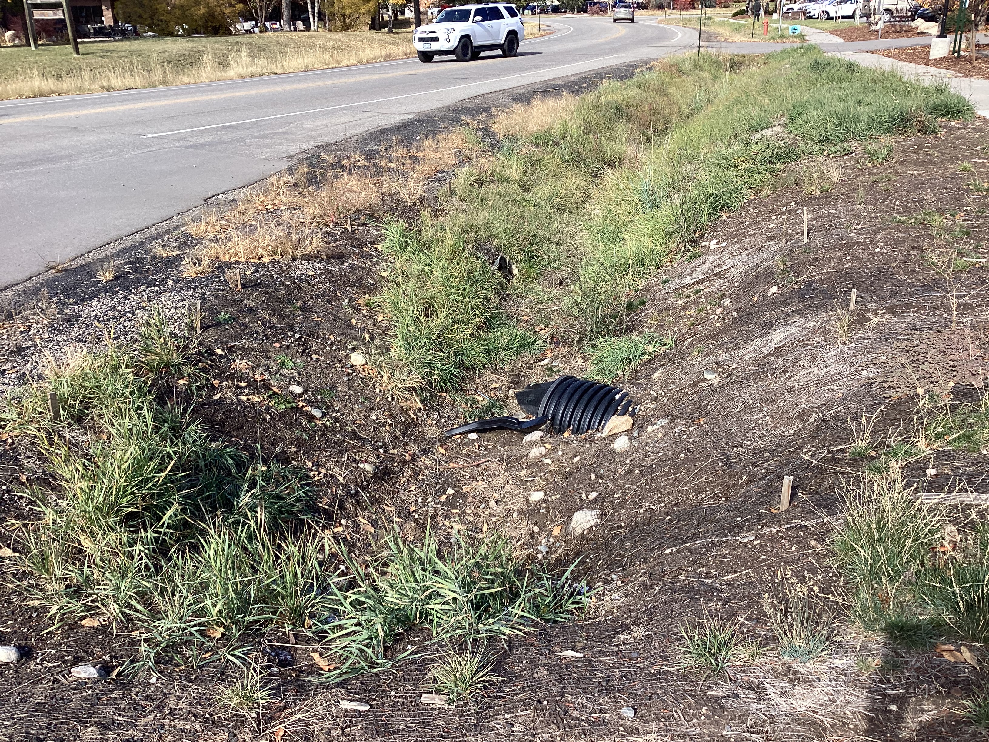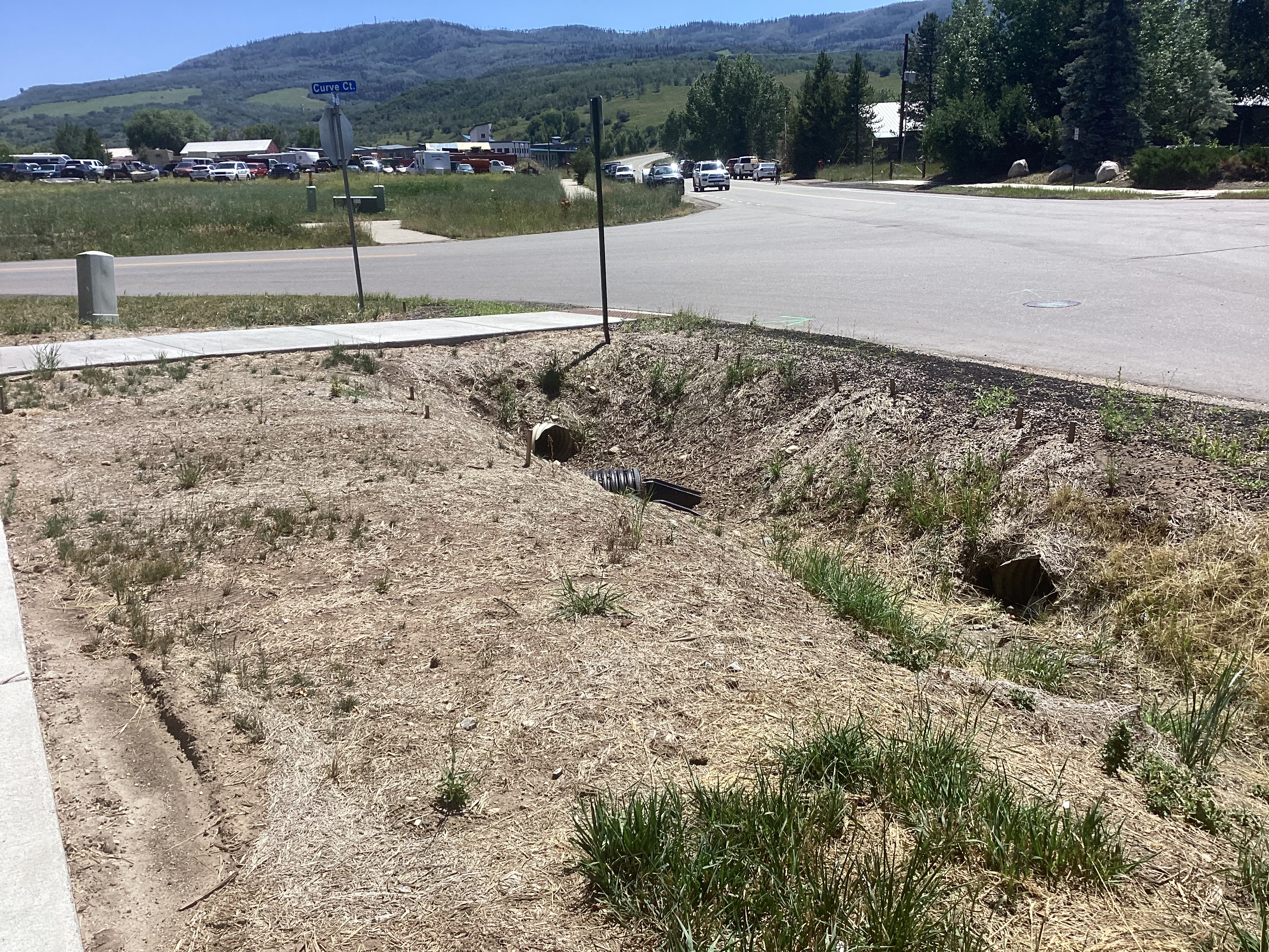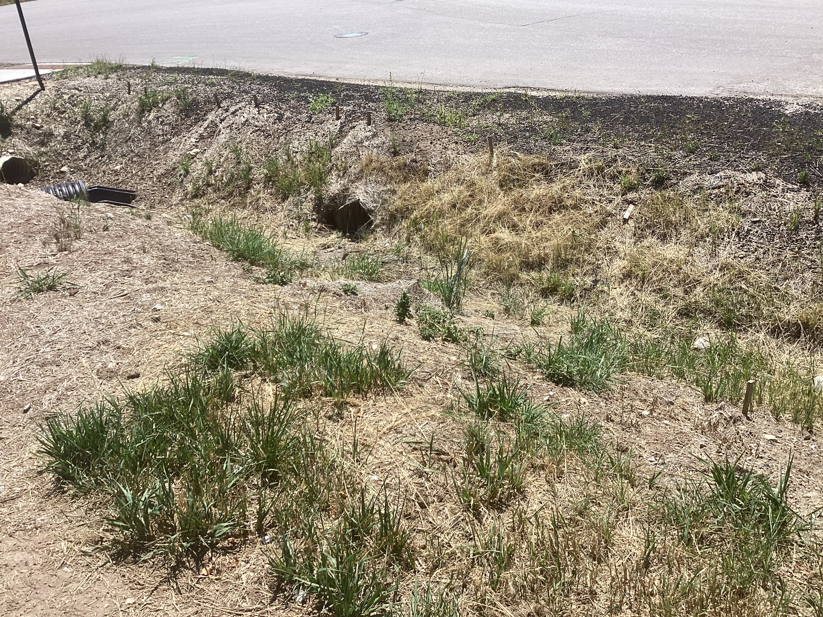 Straw wattle check dams in need of maintenance at corner of Shield Dr. and Curve Ct.