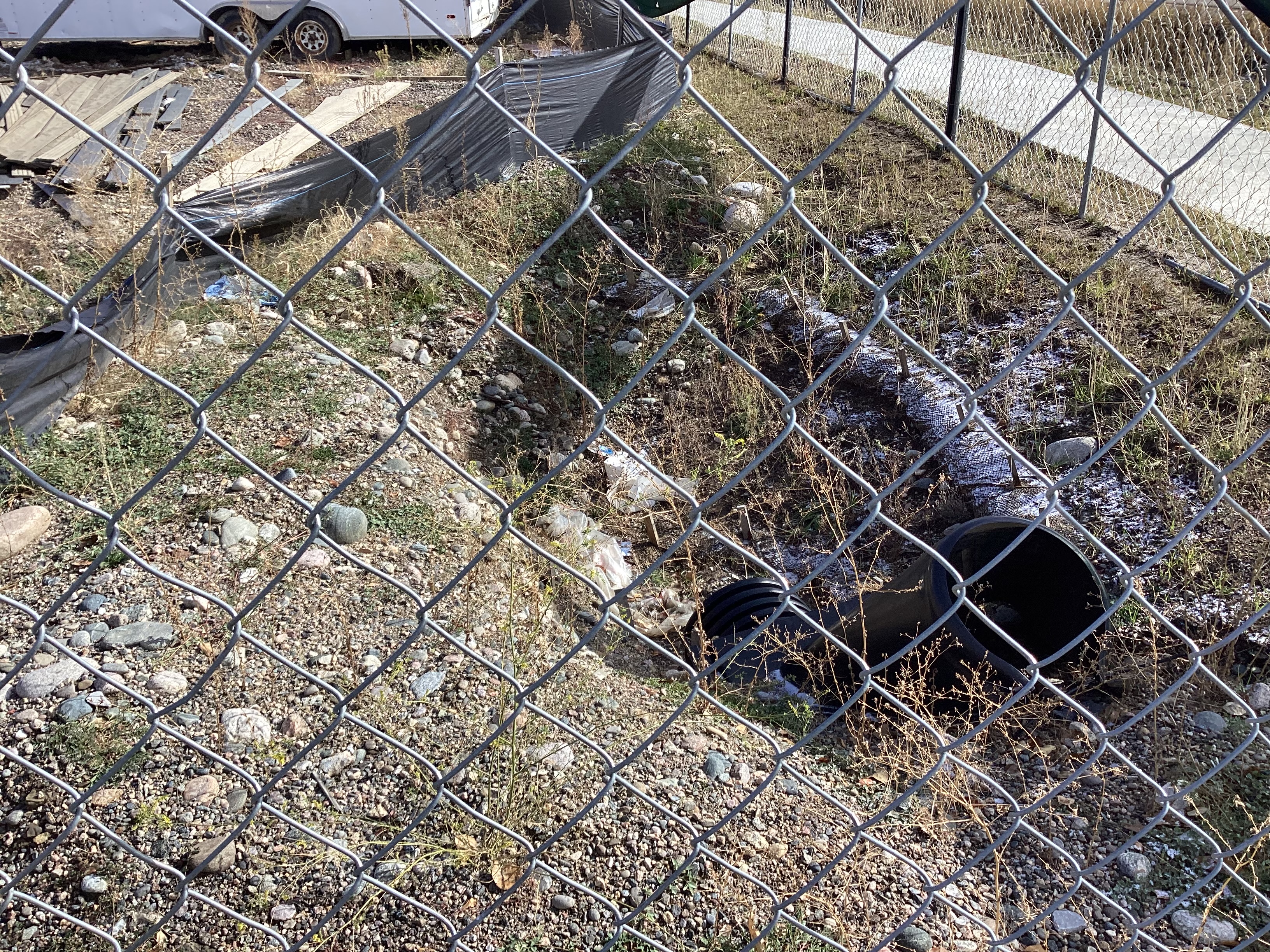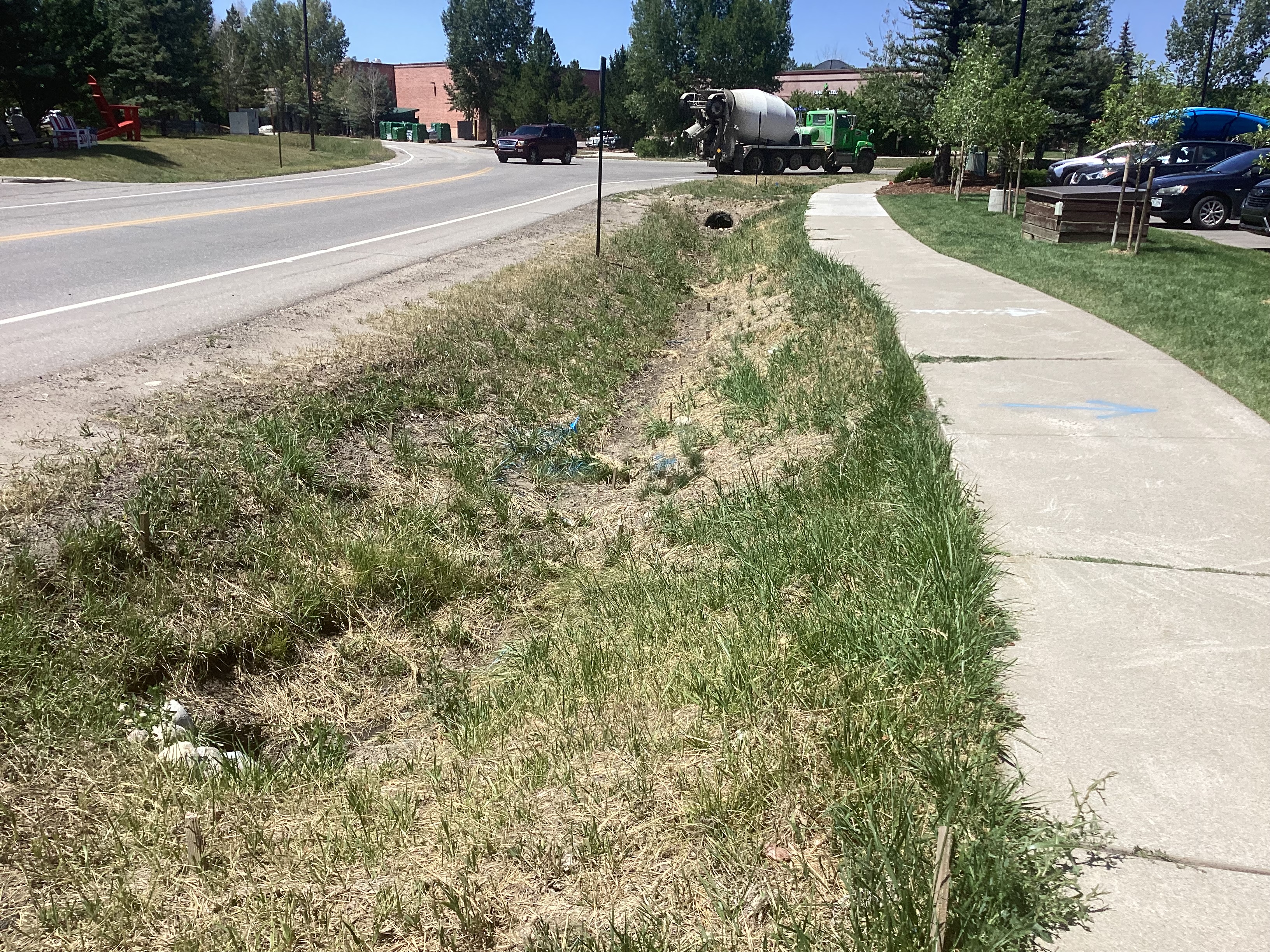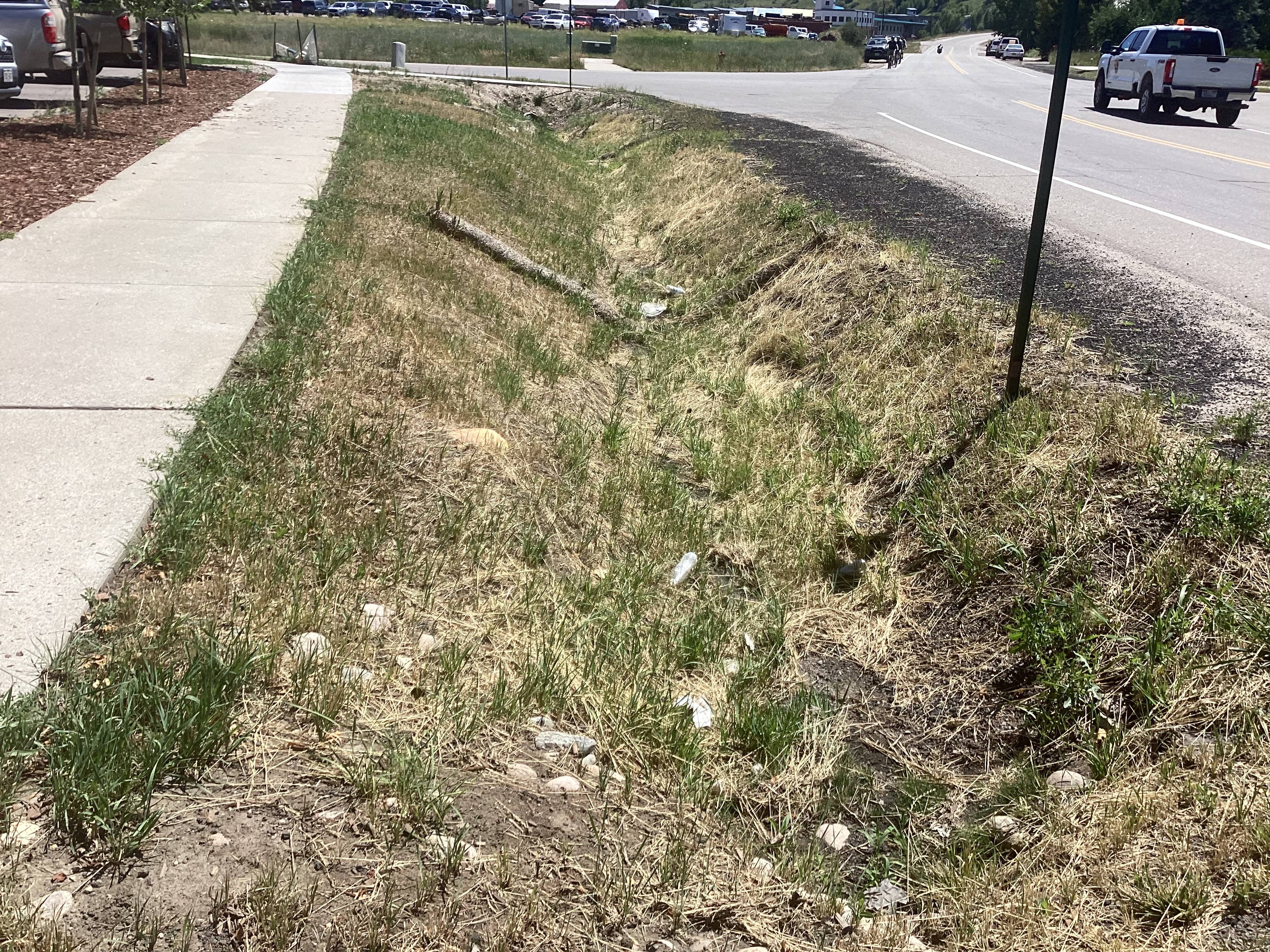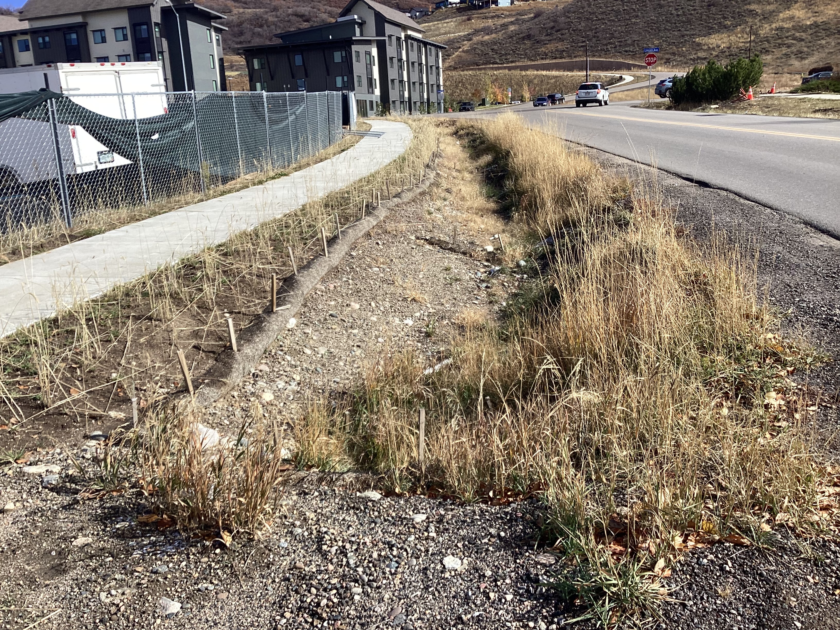 Straw wattle check dams in need of maintenance at corner of Shield Dr. and Curve Ct.