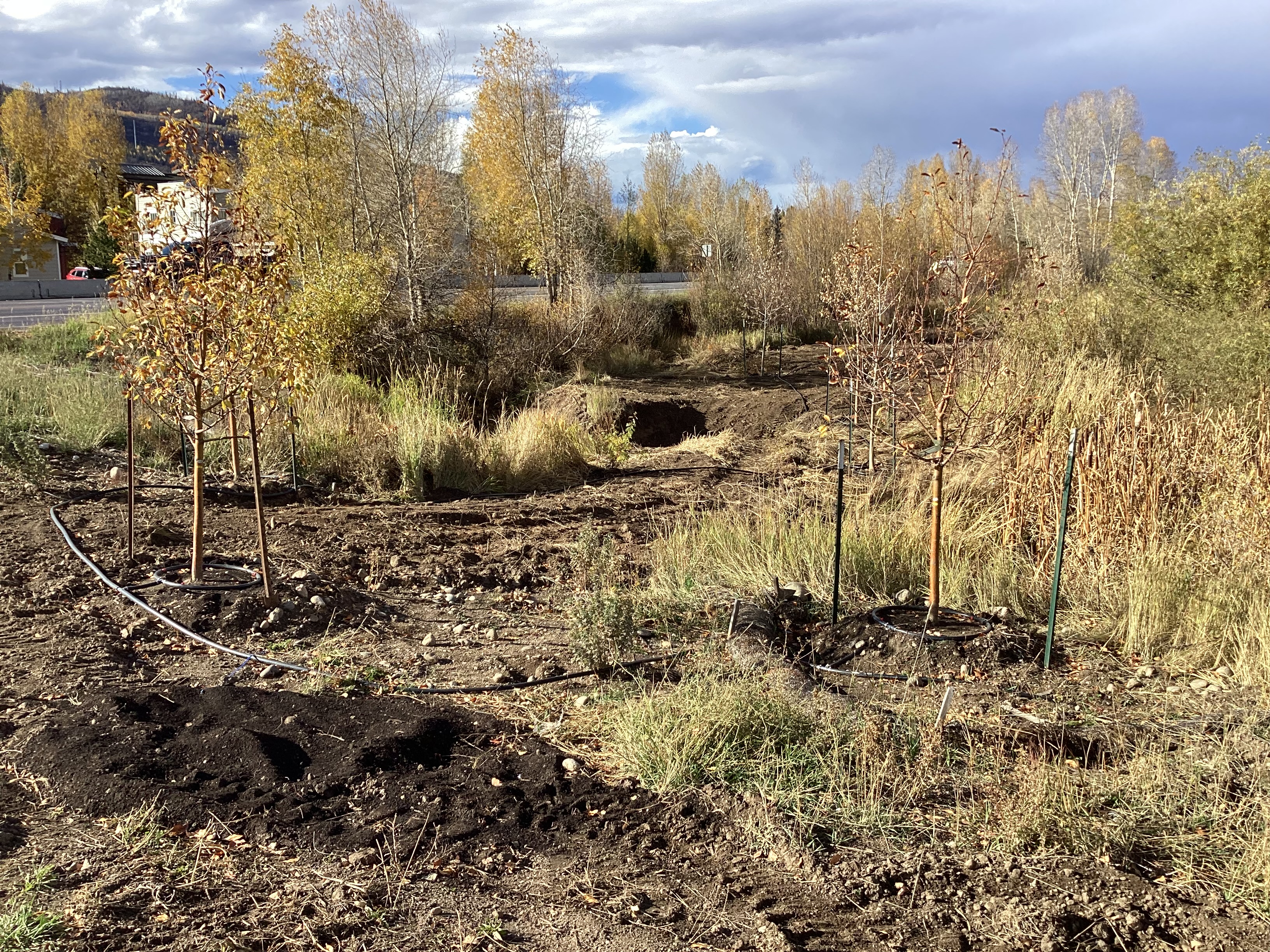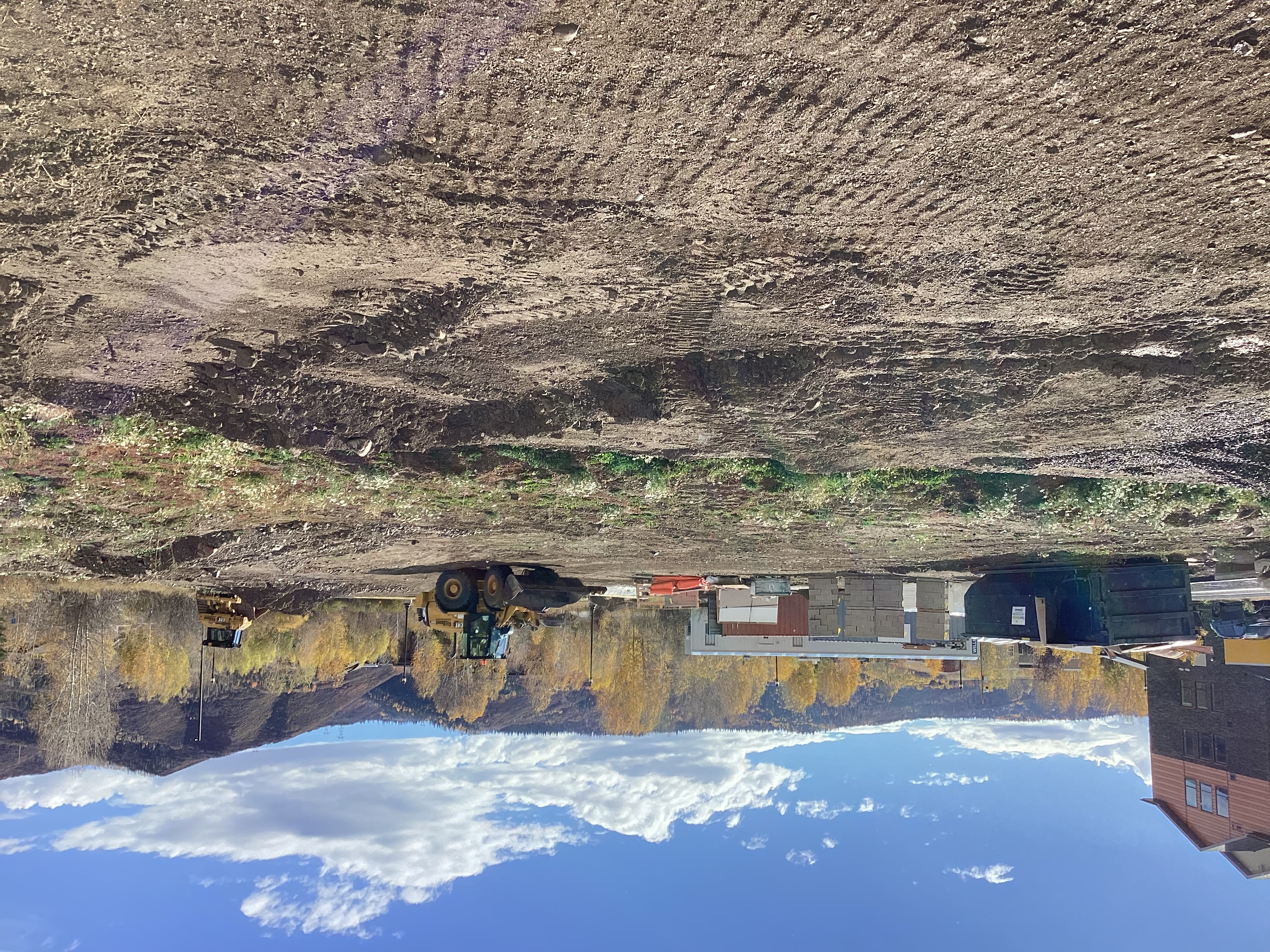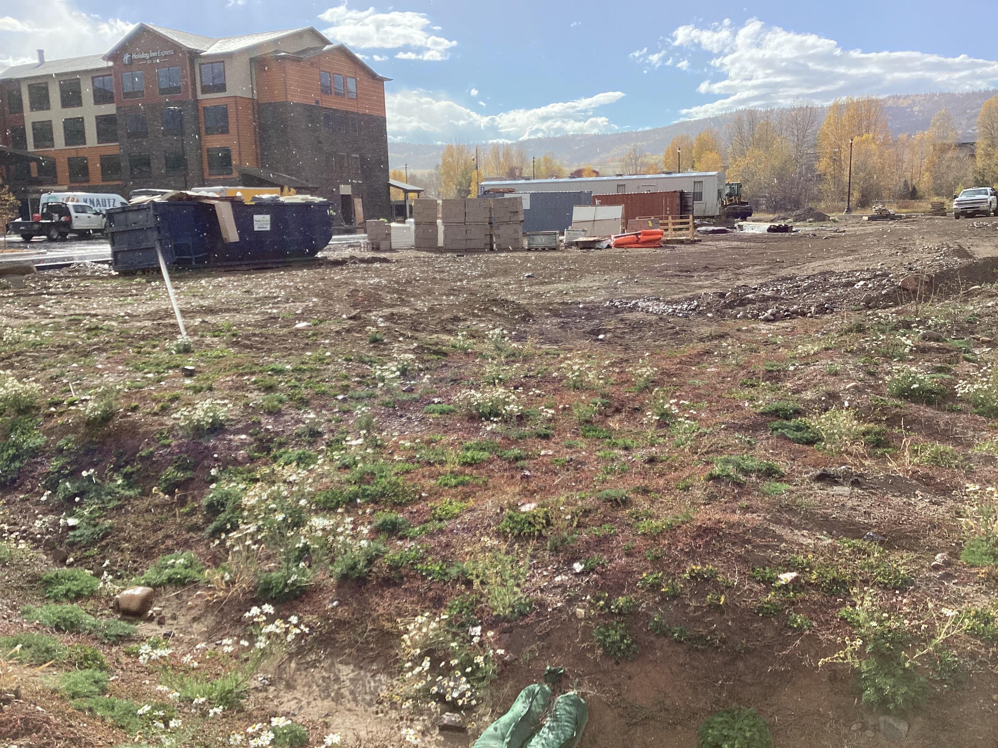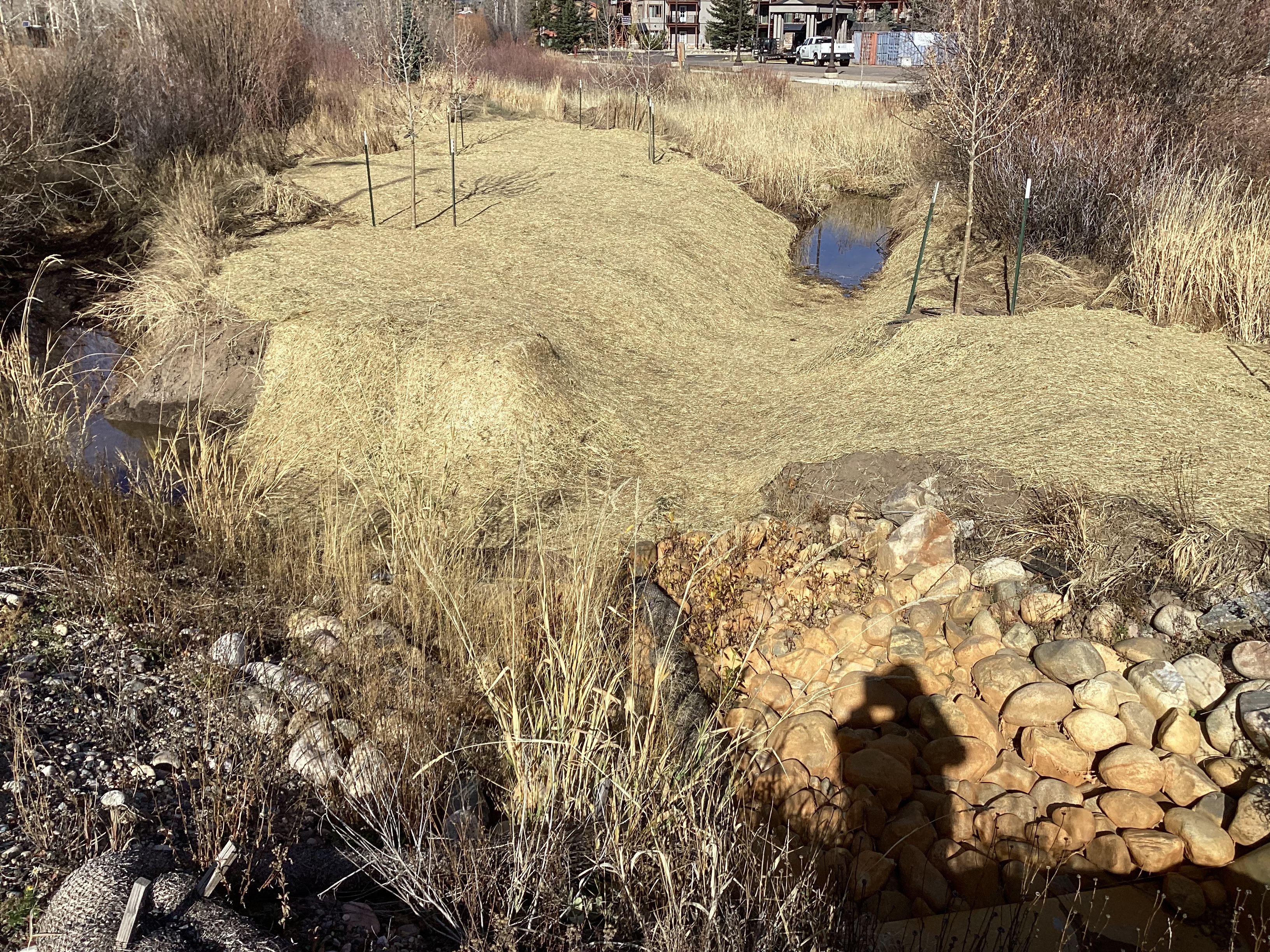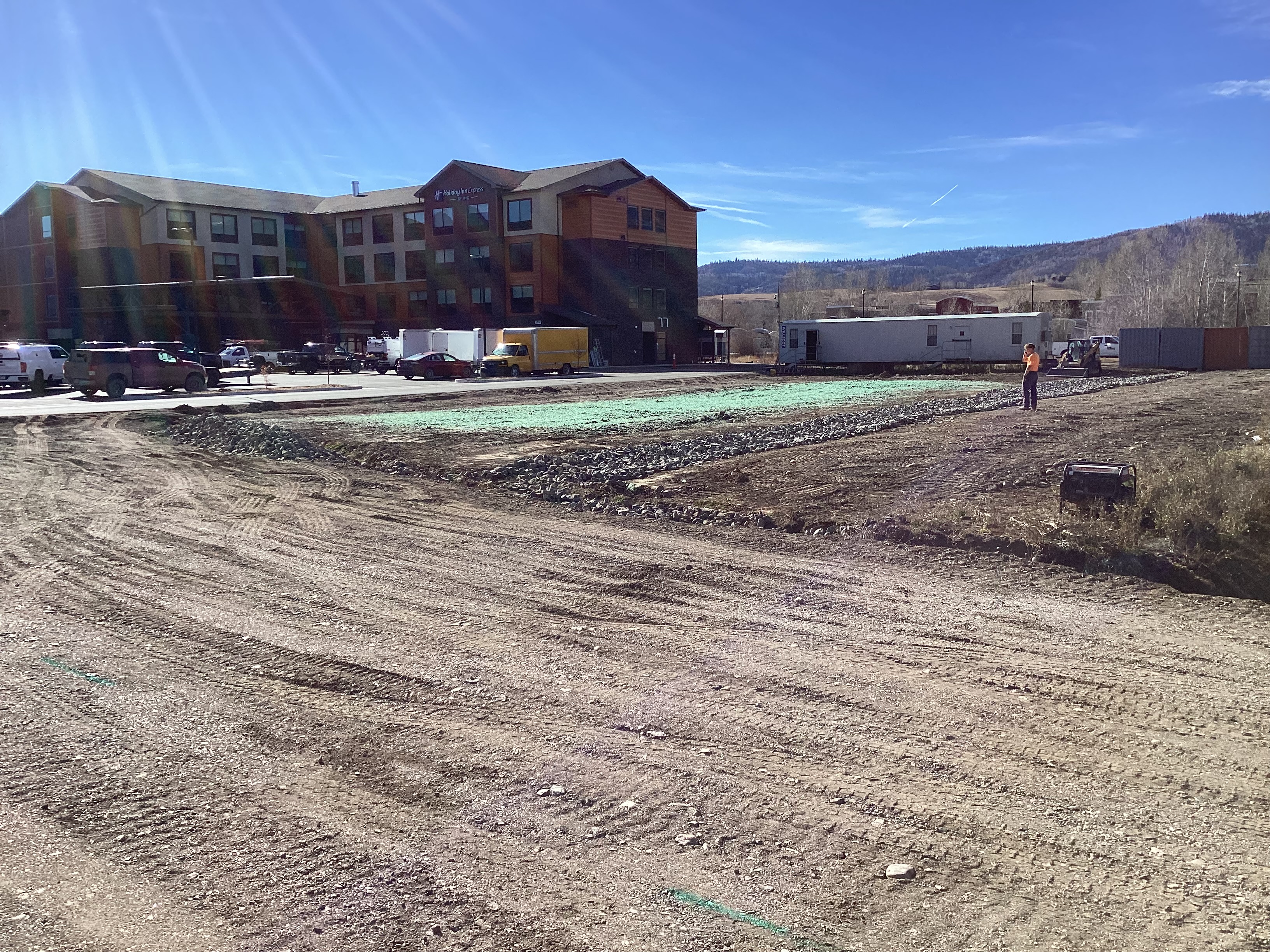 Stabilize disturbed area where landscaping was installed in the drainage area at the southwest corner of the property by November 1. Install erosion control blankets on slopes steeper than 3:1. Temporary soil stabilization is required on all portions of the site where grading and land disturbing activities are complete and on any portion of the site that is inactive for at least 14 days. Soil stabilization includes temporary seeding, hydroseeding, tackifier application, mulching, hydromulching, compacting, surface roughening, tarping, and installing erosion control blankets.