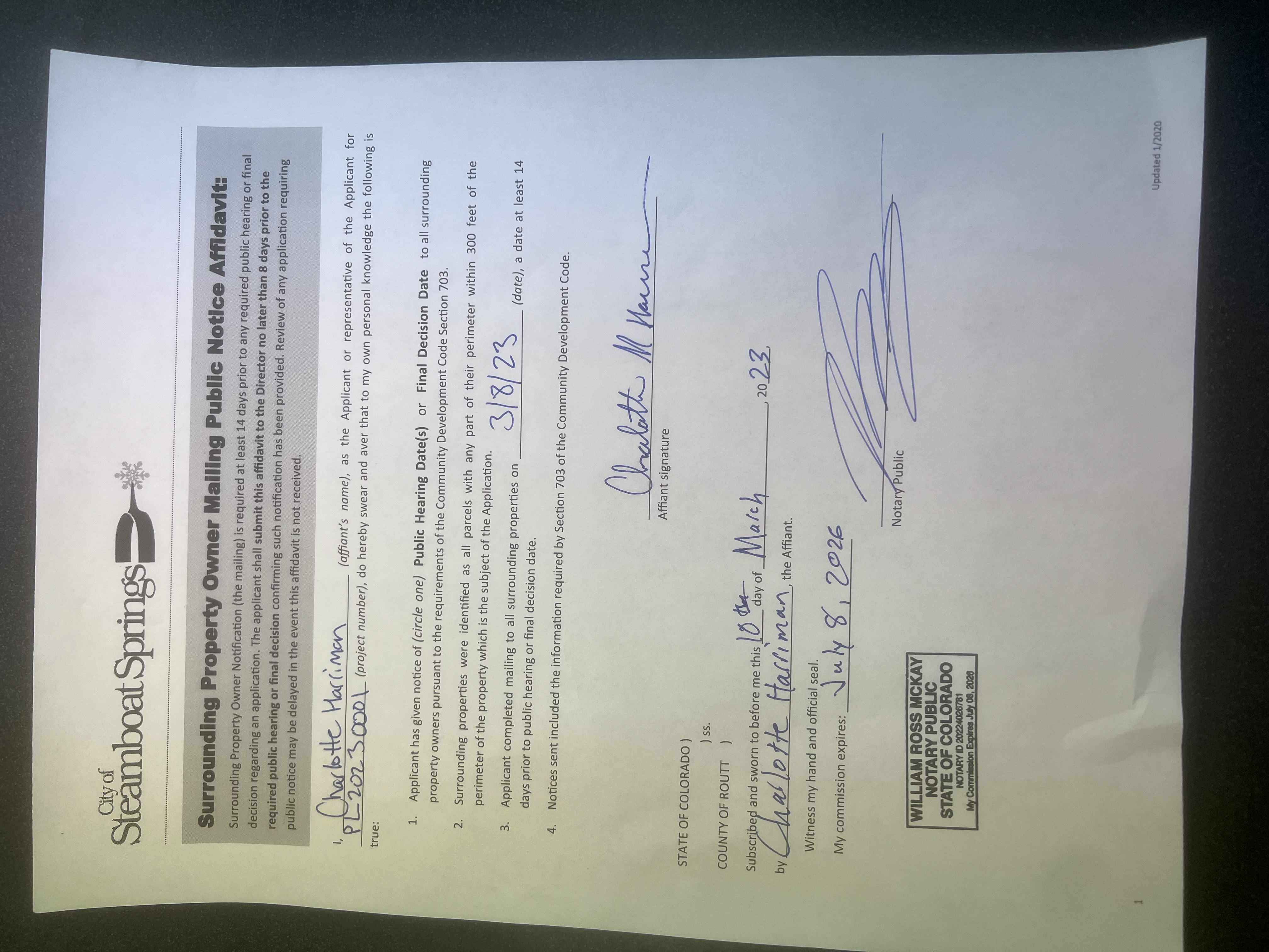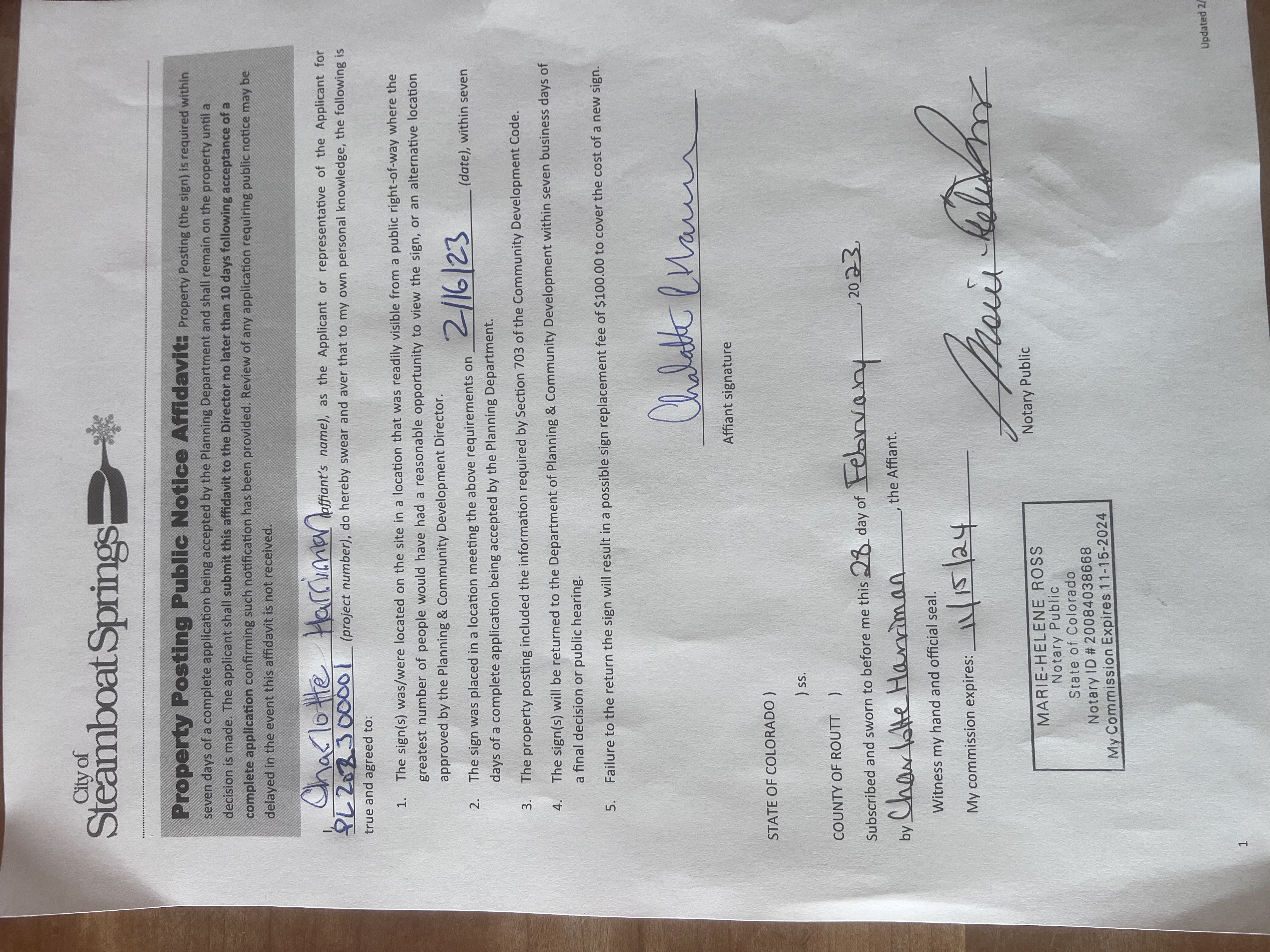 Property Posting (the sign) is required within seven days of a complete application being accepted by the Planning Department.